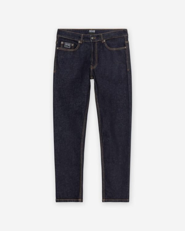 Men’s skinny jeans in a dark wash with five-pocket design. Contrasting stitching and Versace Jeans Couture label embroidered on the front.