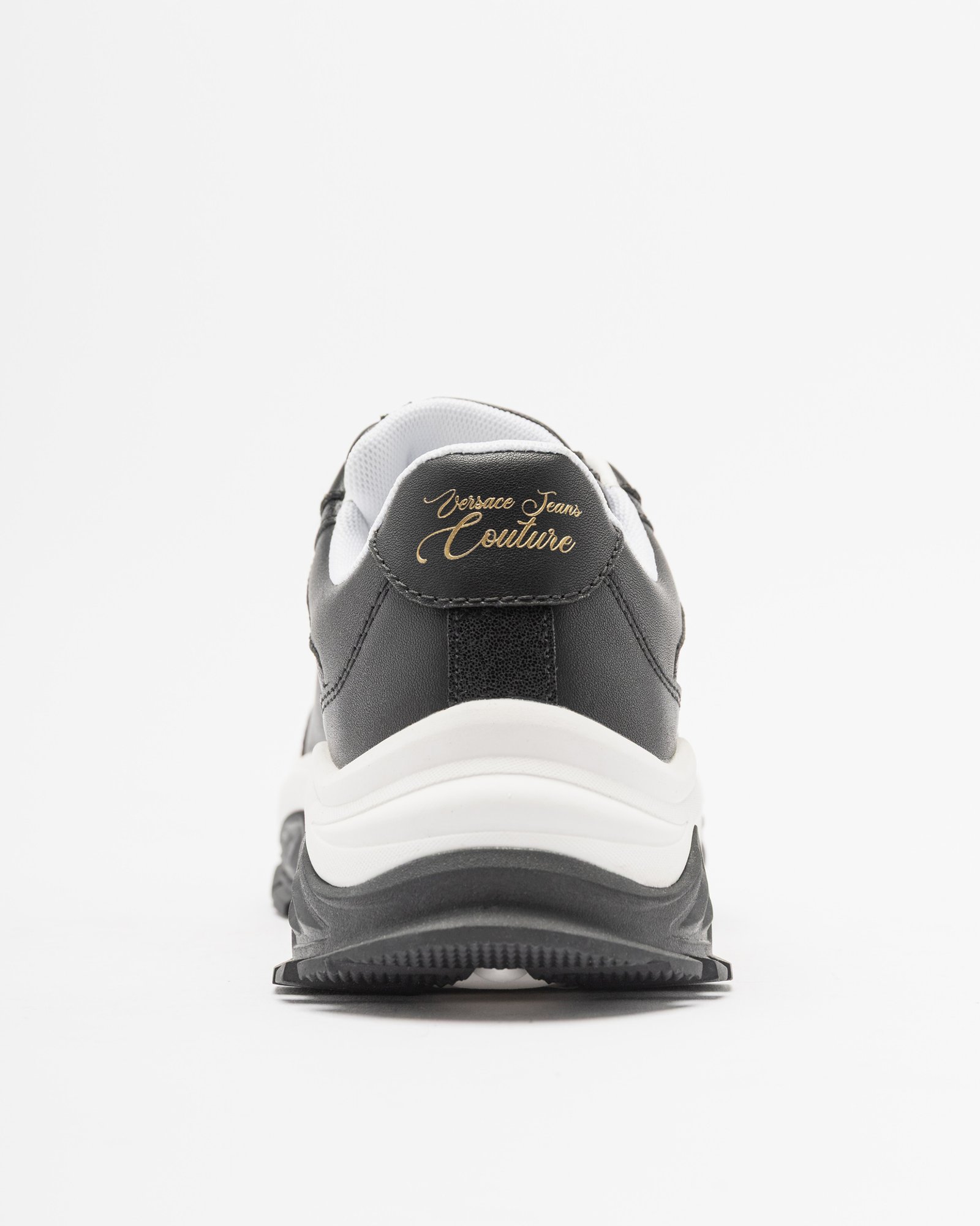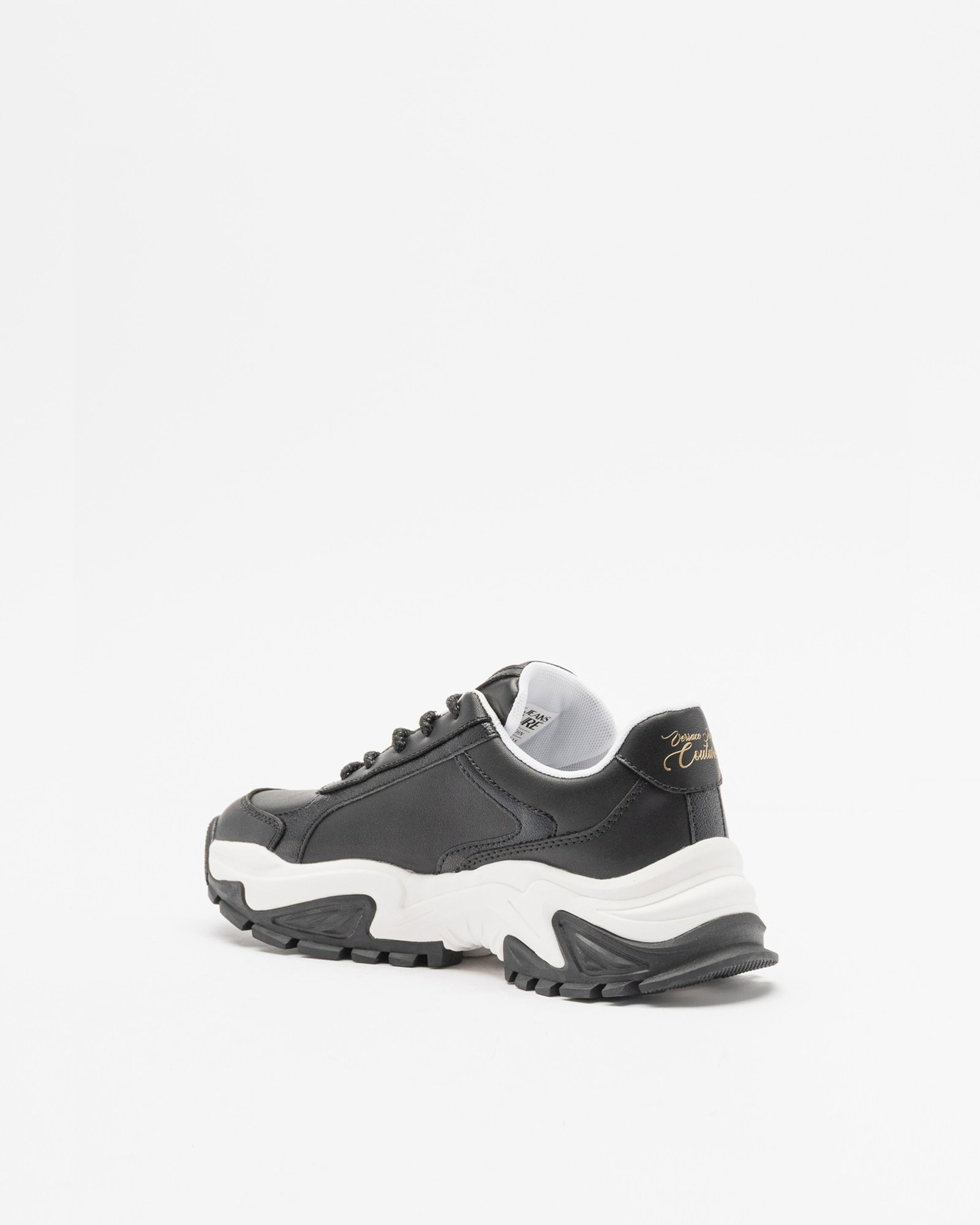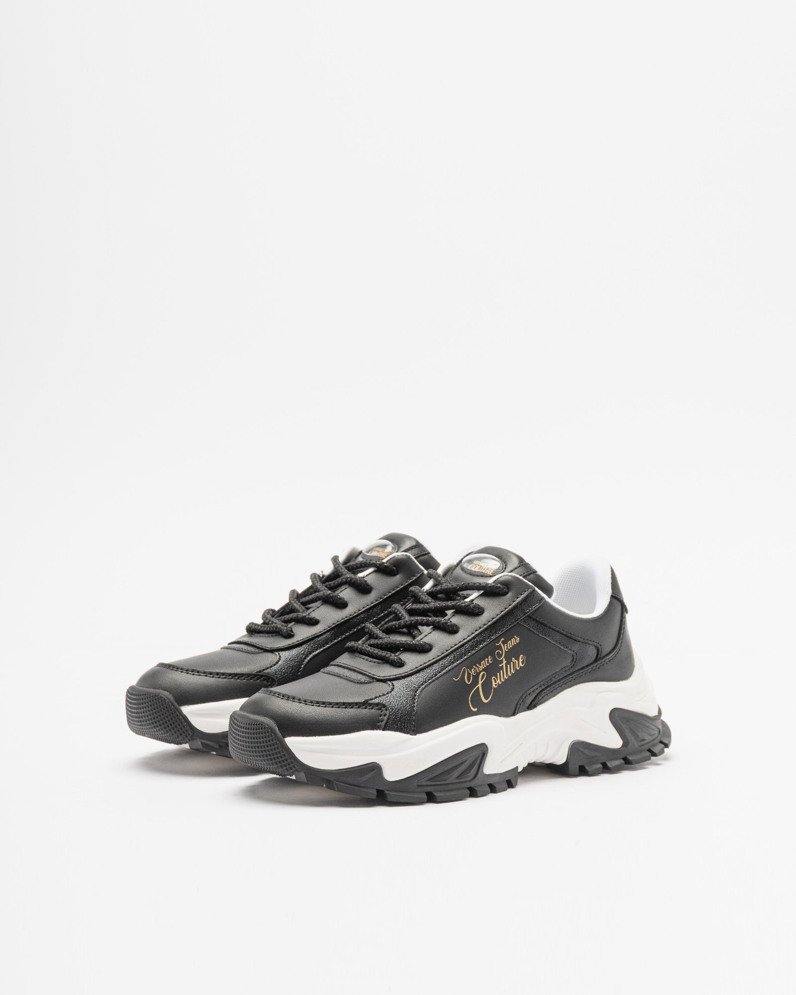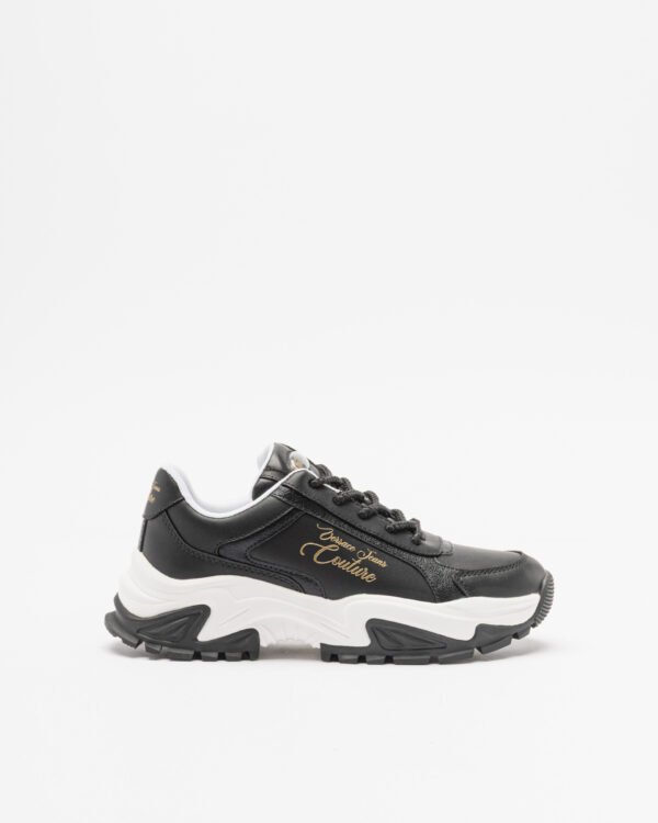 Black women’s sneakers with a chunky, high sole. Synthetic leather upper with gold Versace Couture logo print on the side and heel.