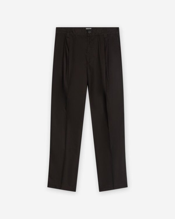 Black pleated trousers for men by Versace Jeans Couture, designed with four pockets and belt loops. Embroidered brand label on the back.
