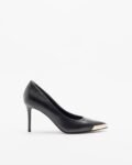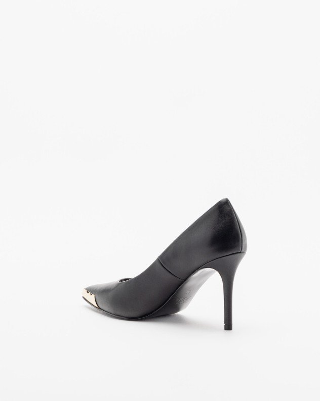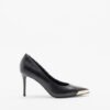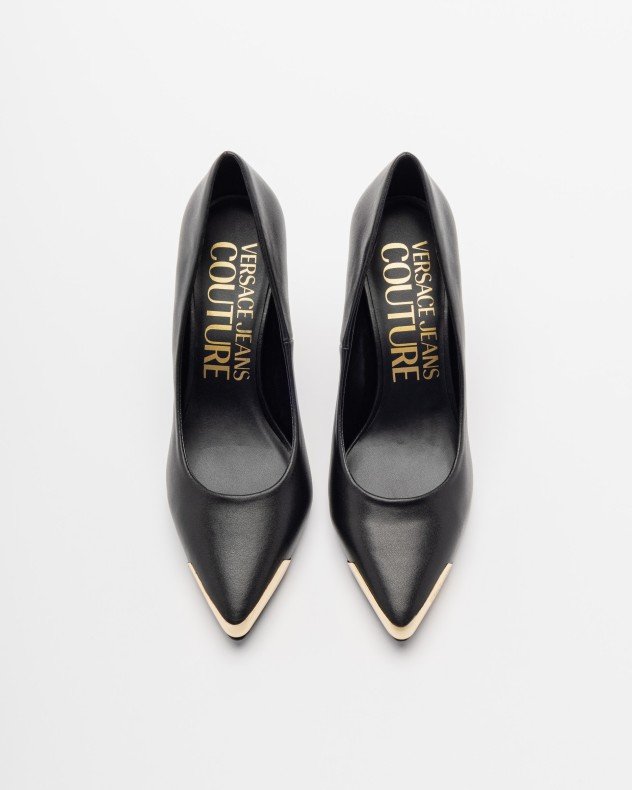Black leather stilettos with metallic detailing on the toe cap that displays the Versace Jeans Couture logo.