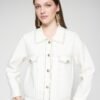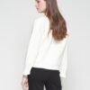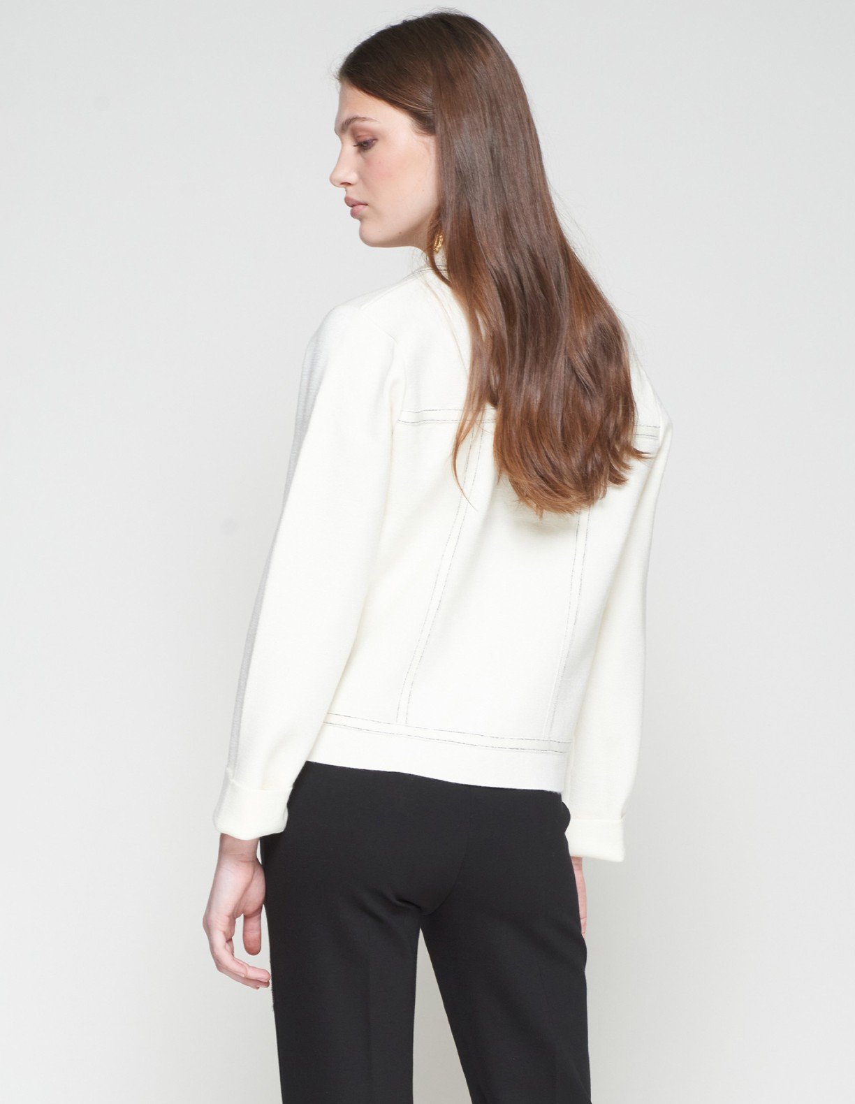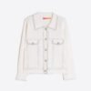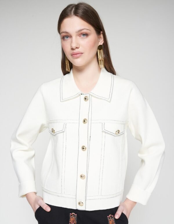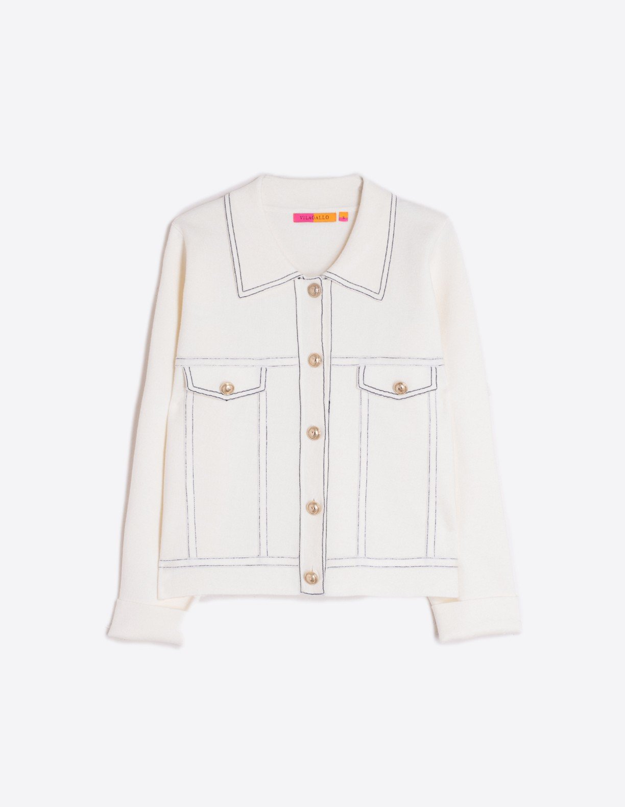 Straight-cut white coat with blue stitching and a pointed collar. Gold button closure with an engraved heart.