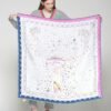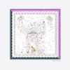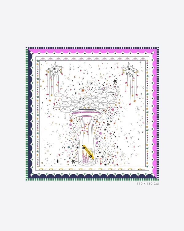 Square silk scarf with a colorful galaxy scene. Wavy edges in pink, green, and navy blue. Glossy satin finish.