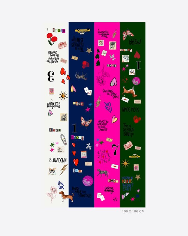 Rectangular scarf with vertical blocks in cream, navy blue, pink and green, filled with graffiti-style messages and graphics.