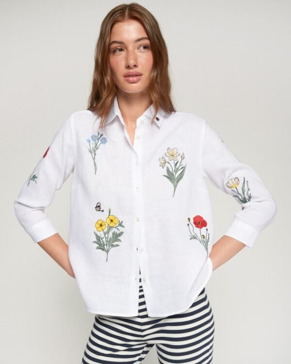 White linen shirt with embroidered flowers on the front and sleeves. Classic collar, button-up front and three-quarter sleeves.
