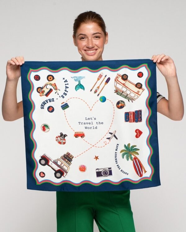 Medium white 100% silk scarf featuring illustrations inspired by summer holidays.
