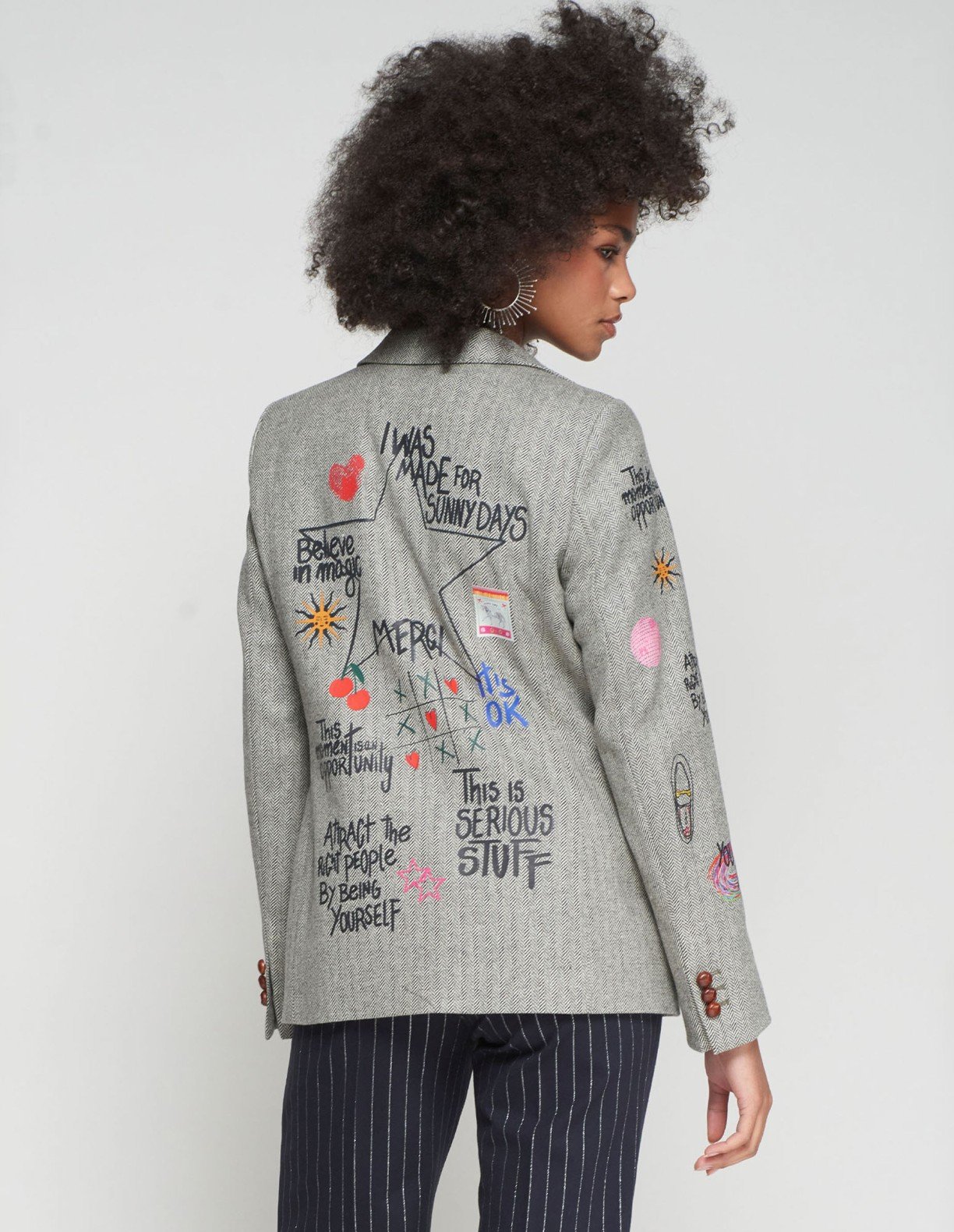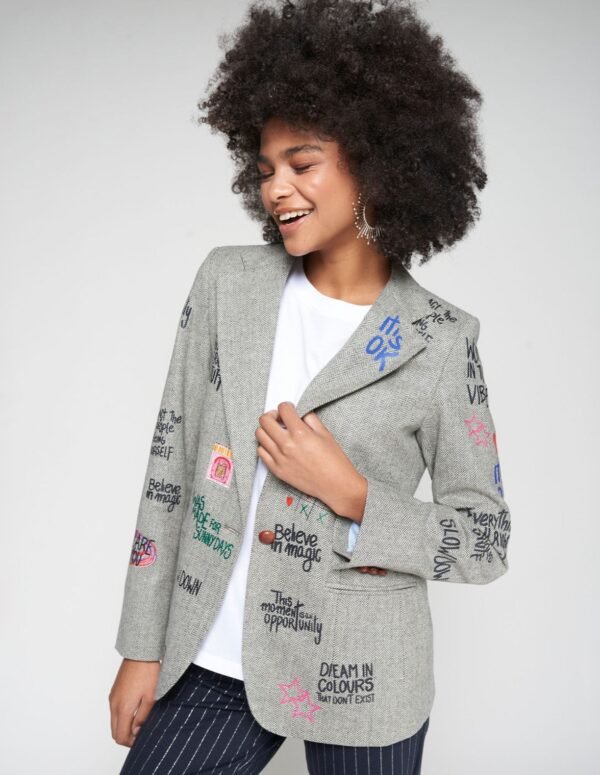 Gray herringbone blazer with a colorful print of phrases and symbols. Straight cut with a classic notch lapel, welt pockets, and three decorative buttons at the cuff.
