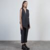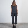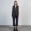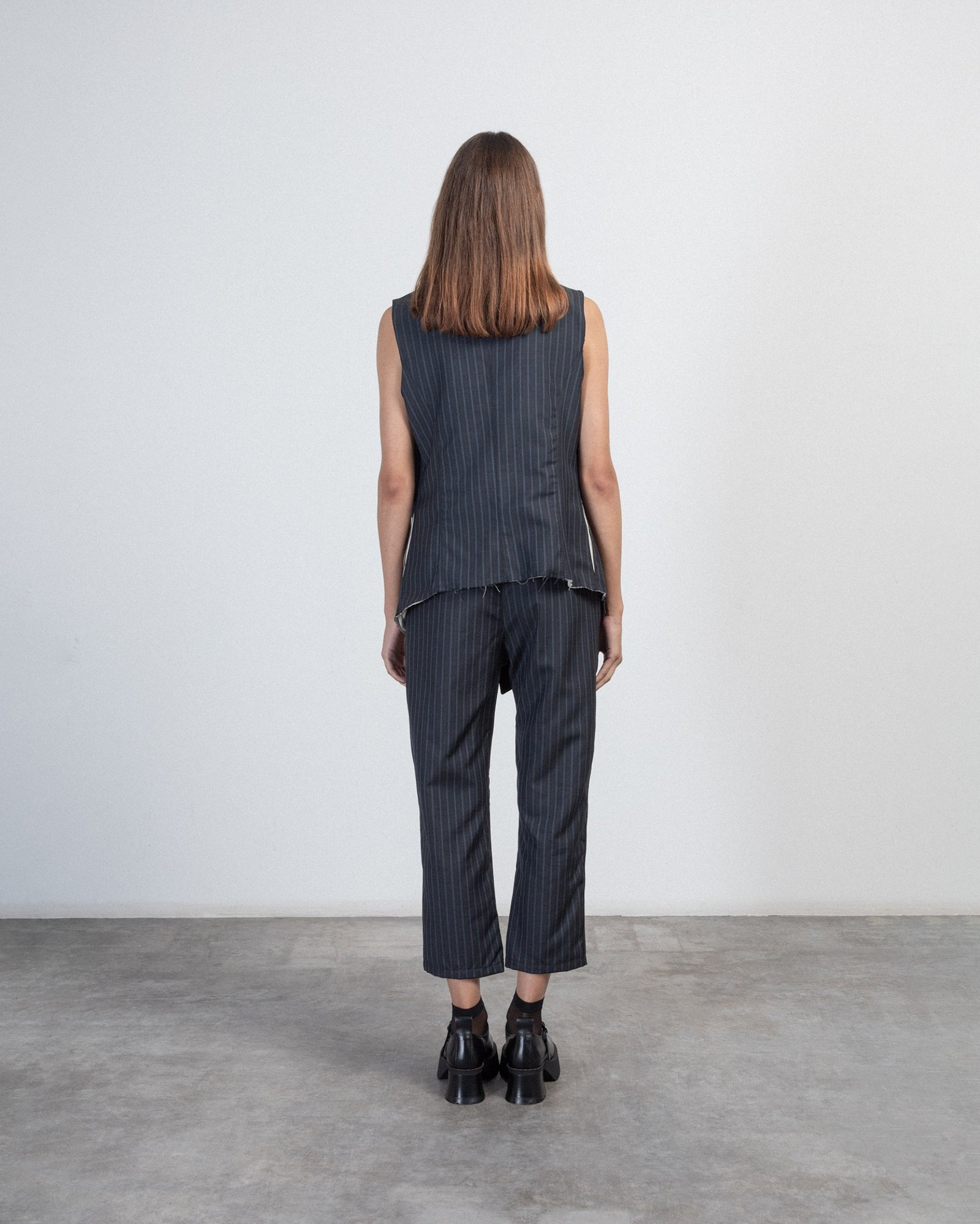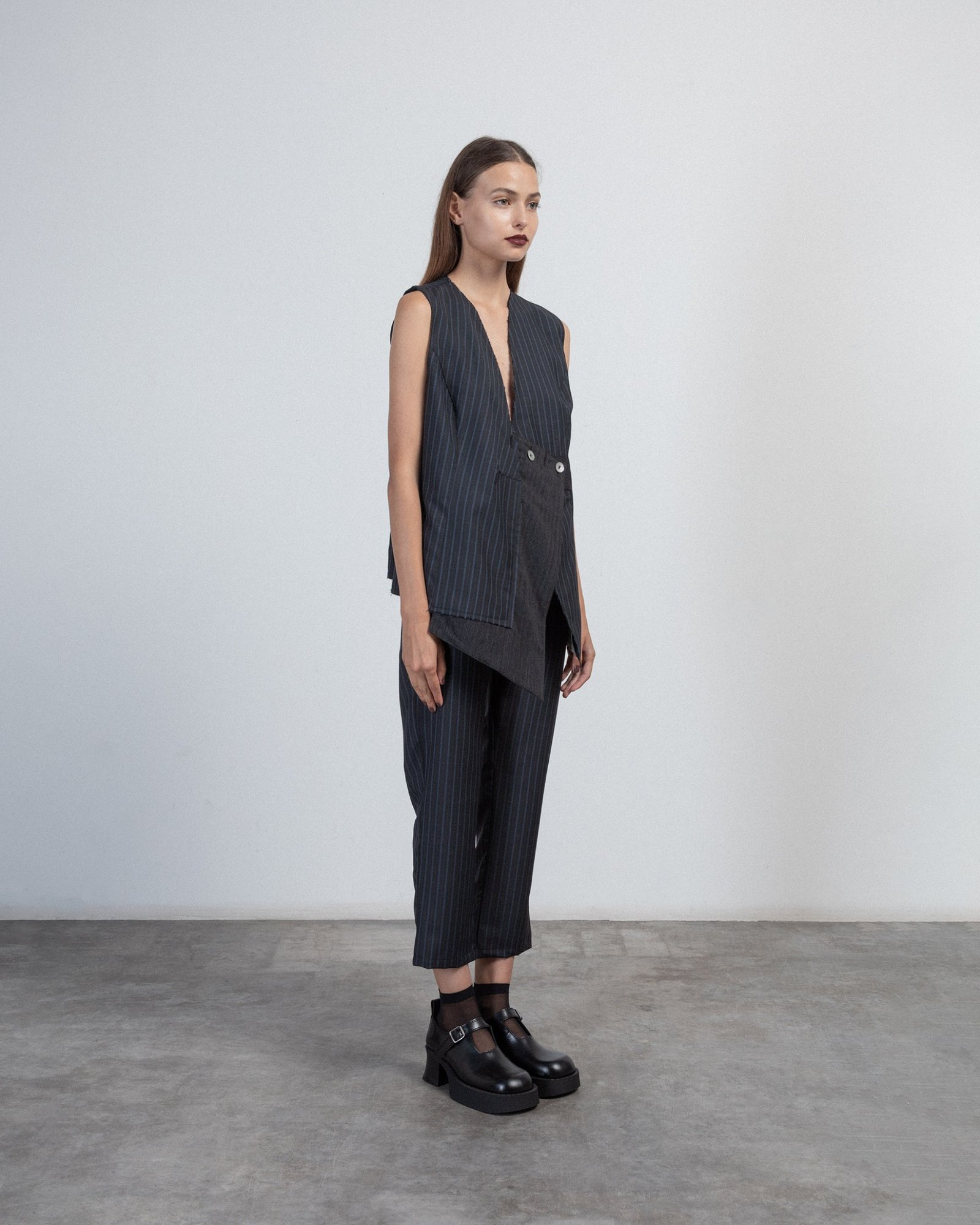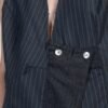 Blue vest with diplomatic stripes and an asymmetrical design. Features topstitching and cut-out details.