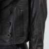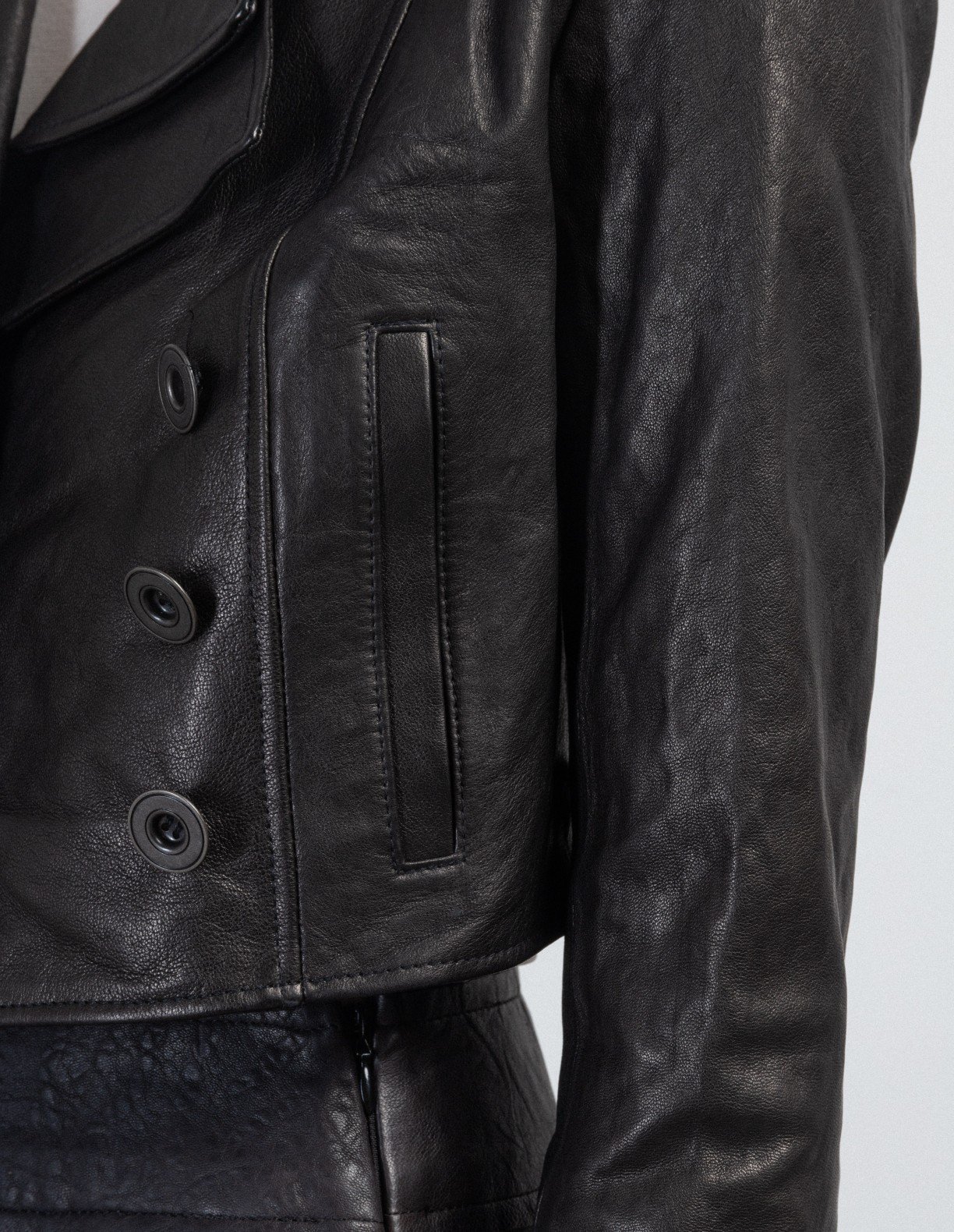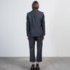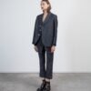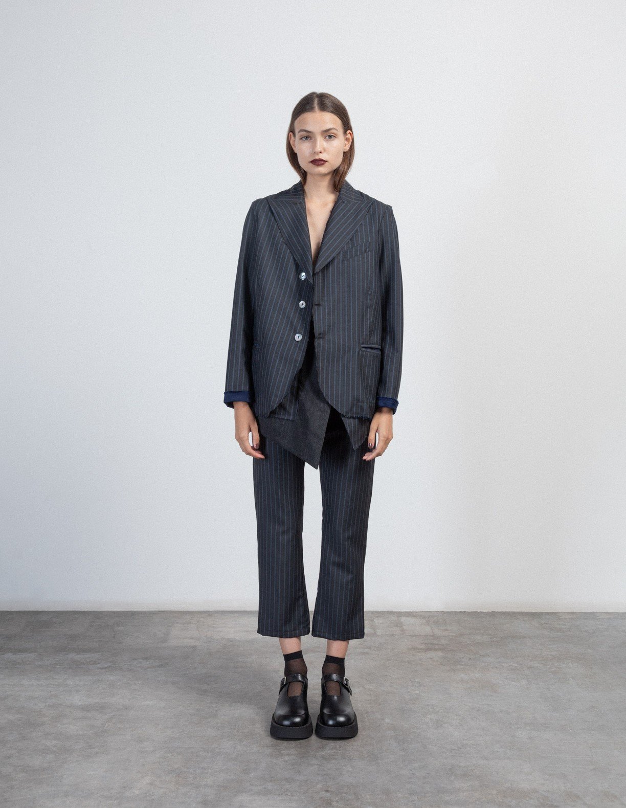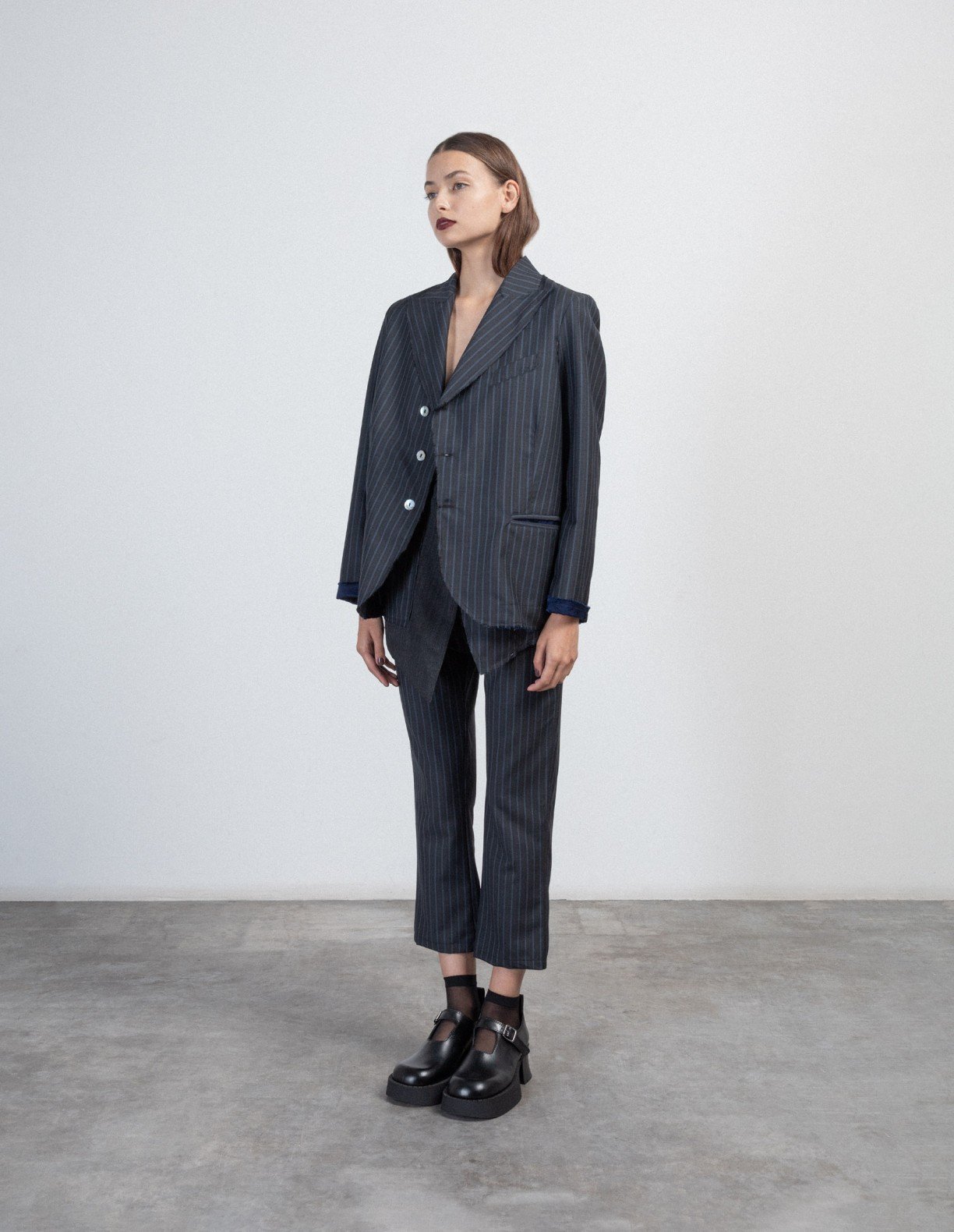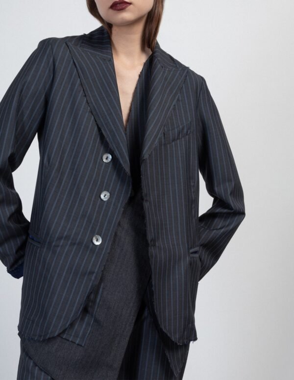 Blue diplomatic stripe blazer with peak lapel. Button closure and frayed finish.