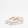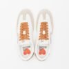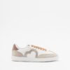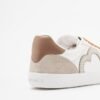 White low-top sneakers by Love Moschino. Leather upper with suede inserts, contrasting details, and a glittery heart on the side.