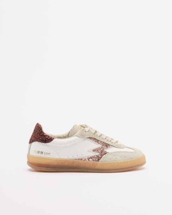White leather low-top sneakers with suede details and sequin embellishment. MOA logo on the side.