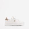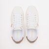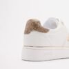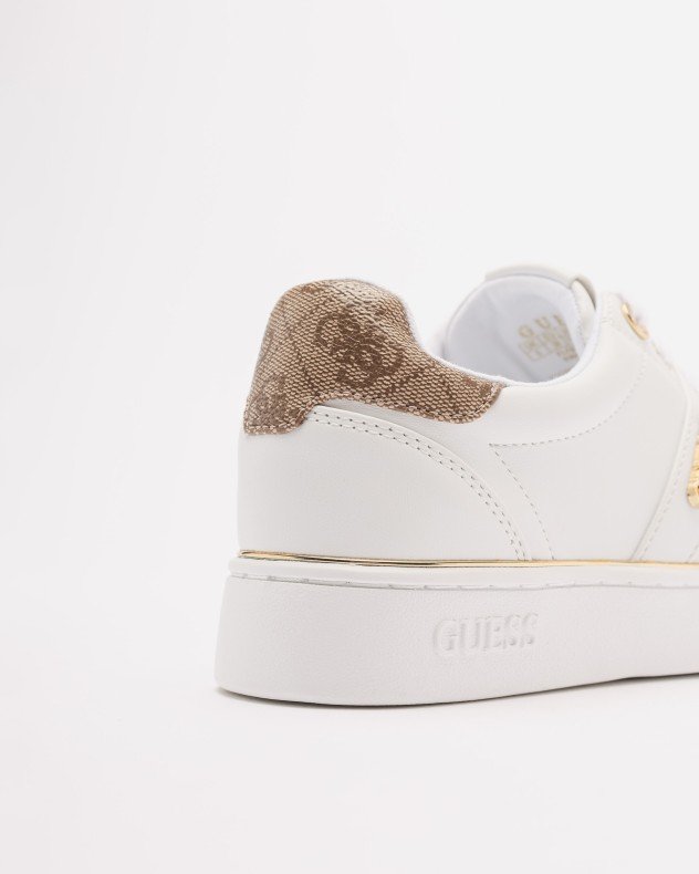 White synthetic leather sneakers with gold details. Beige heel with monogram pattern and metallic GUESS logo on the side.