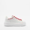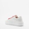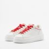 White sneakers with satin red laces and a glittery heart detail. The Love Moschino logo is printed on the side.