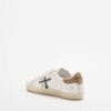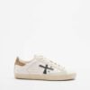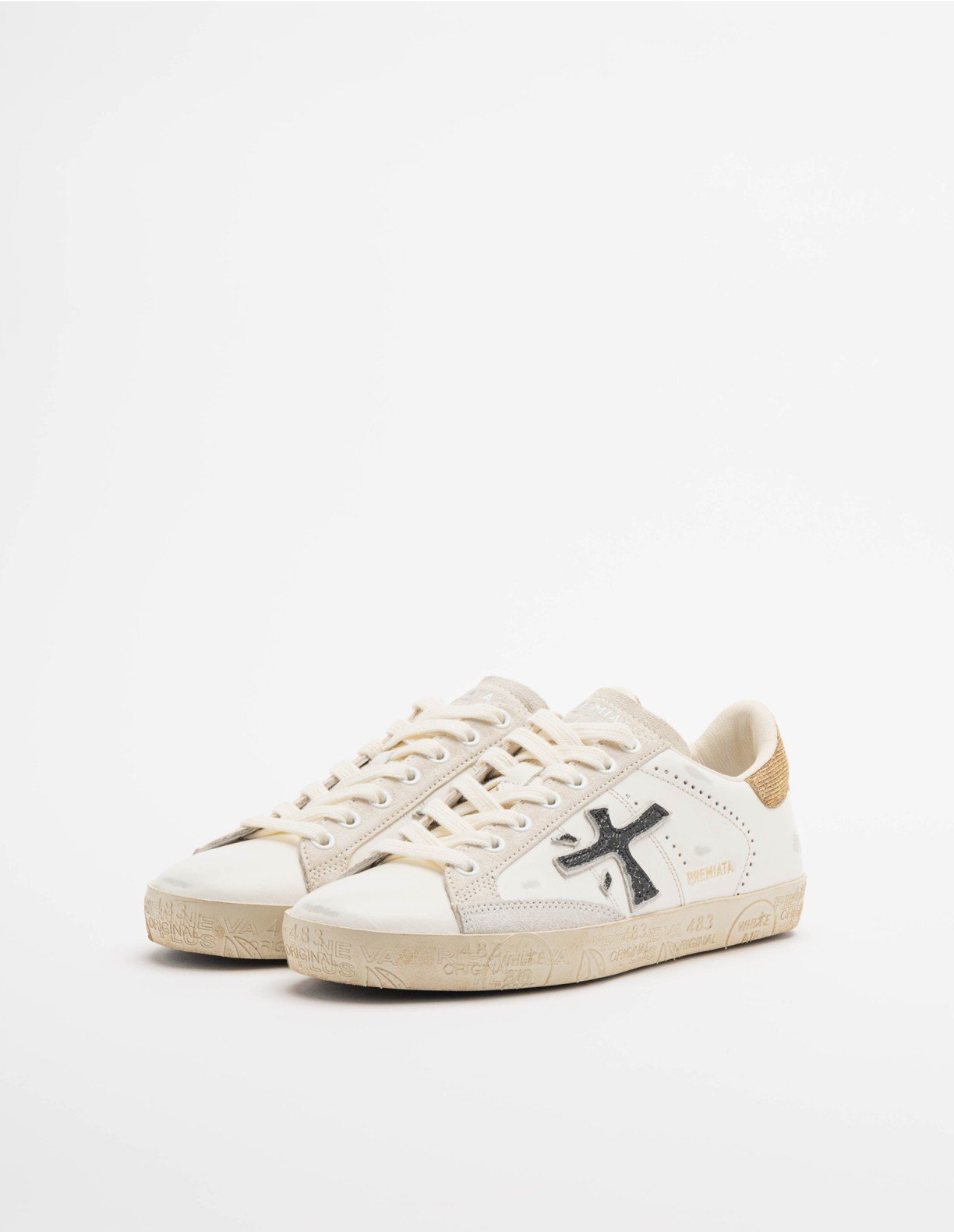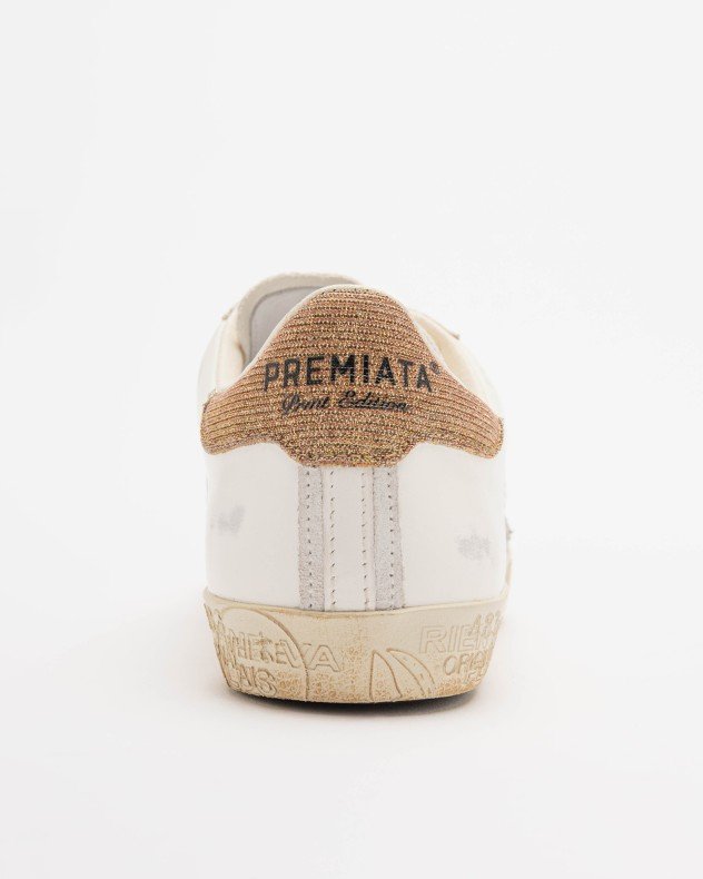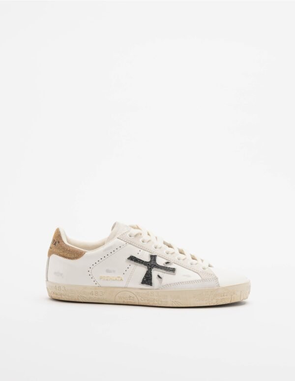 Premiata sneakers with a white leather upper with a distressed effect and beige suede inserts. Rhinestone heel tab.